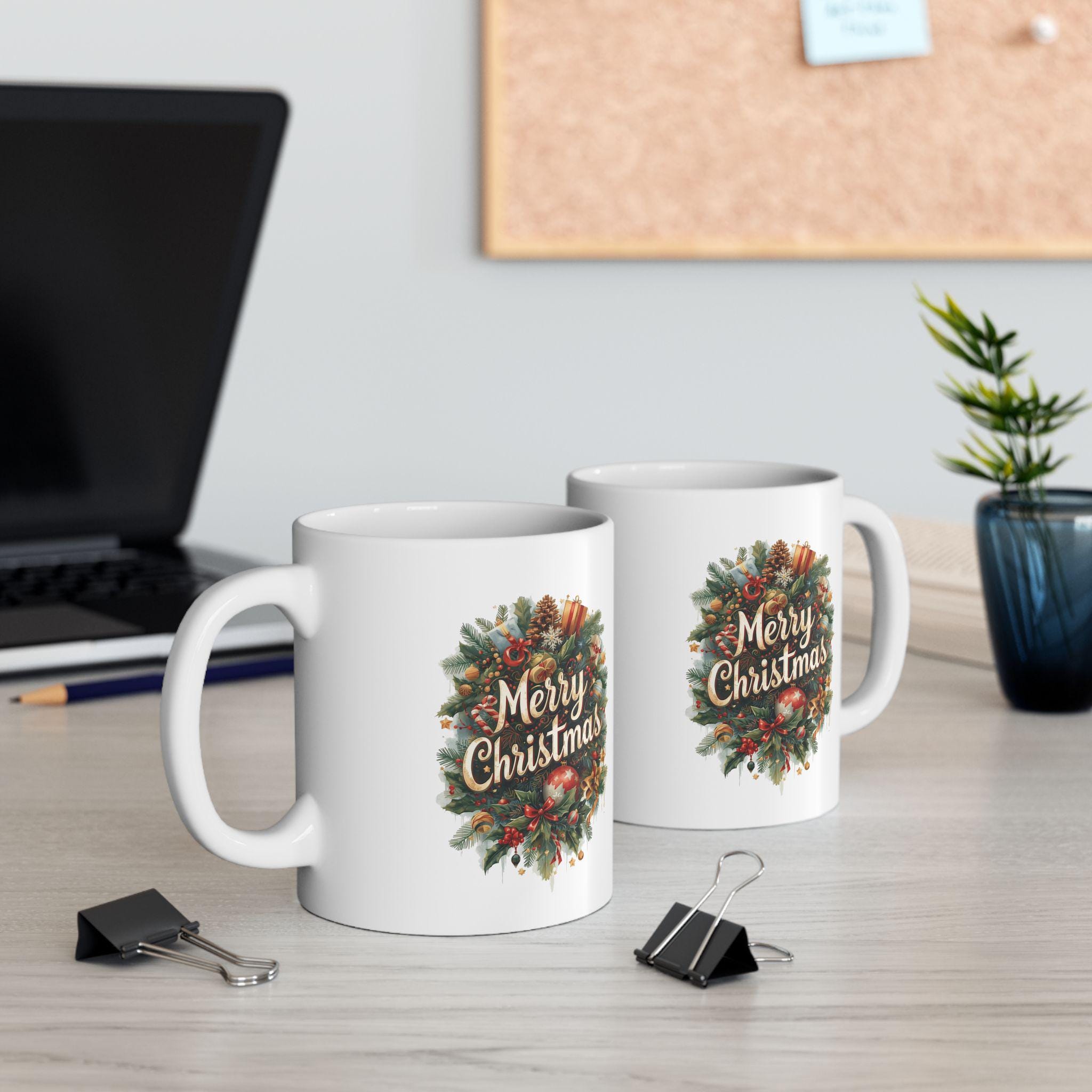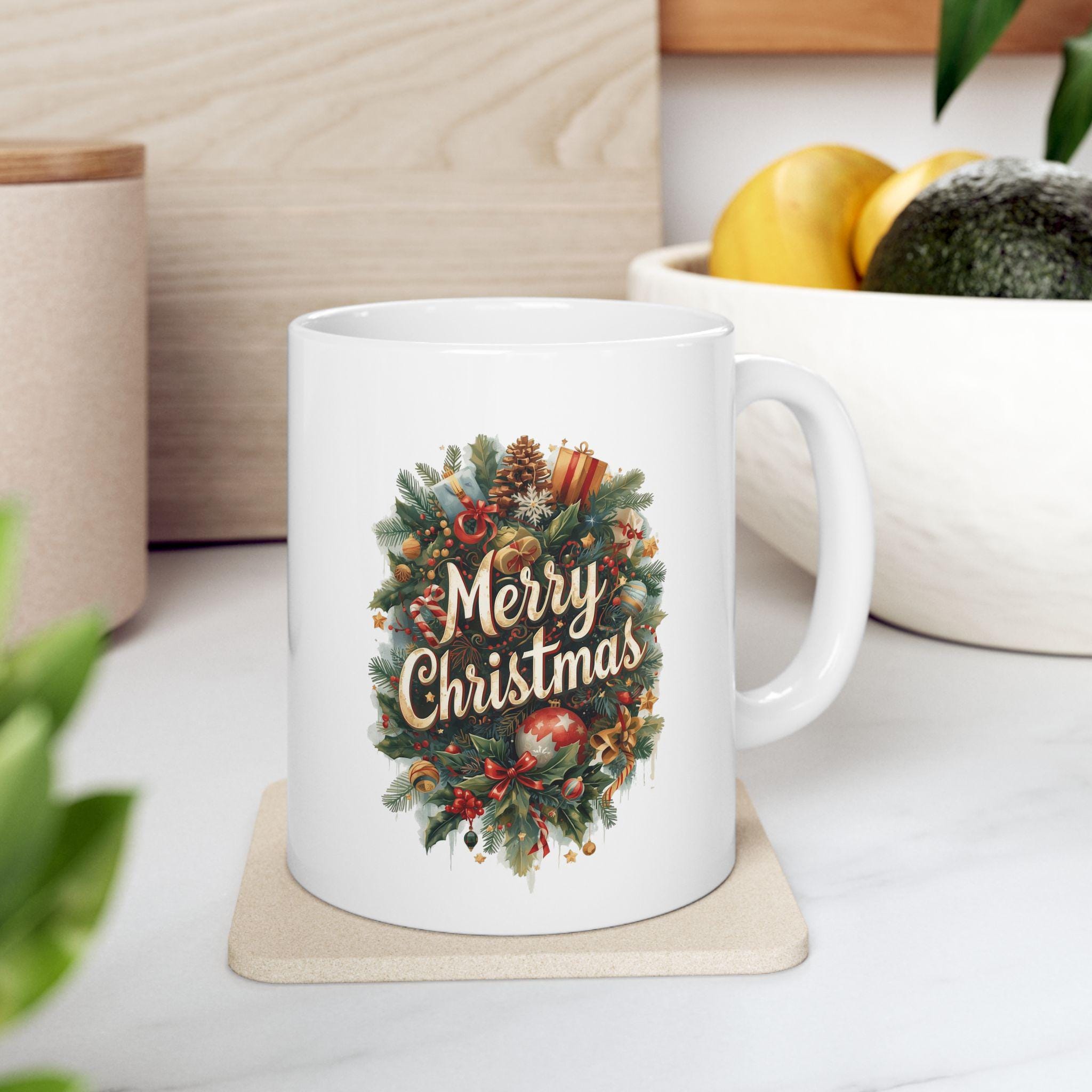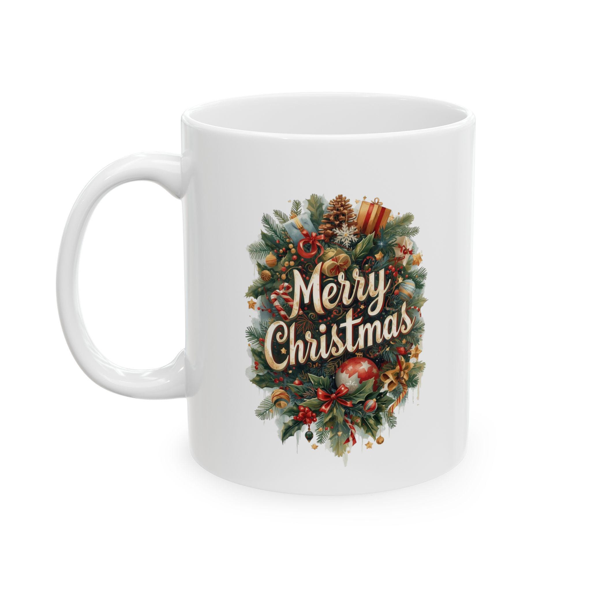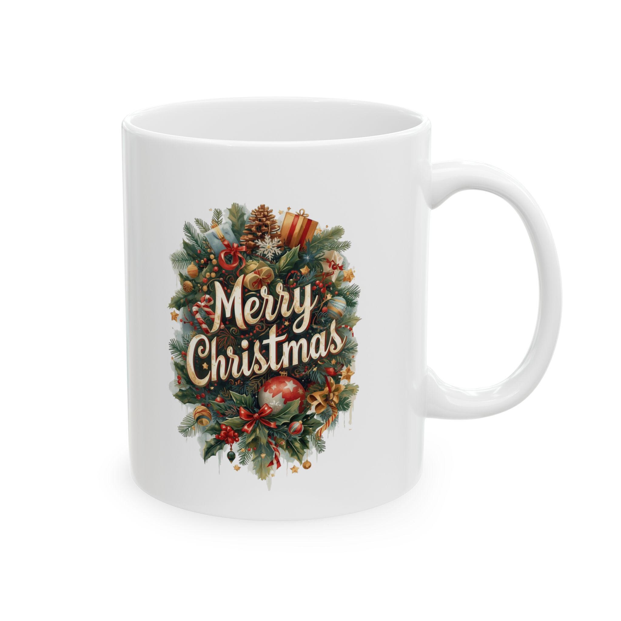 A festive Christmas-themed ceramic mug perfect for enjoying your favorite hot beverages during the holiday season. This mug is ideal for anyone looking to add a touch of holiday cheer to their daily routine. The design is relevant for Christmas celebrations and makes a great gift for friends and family.