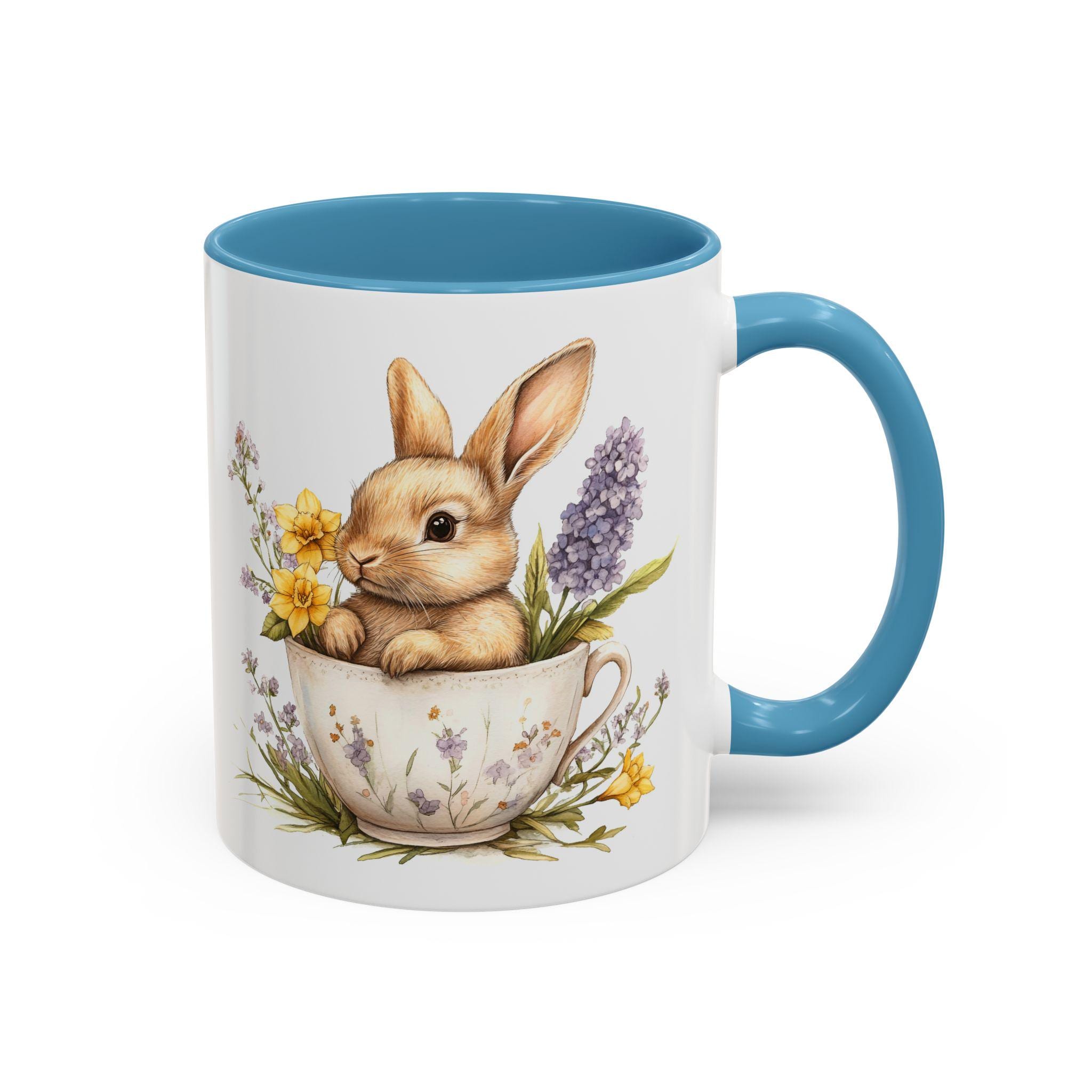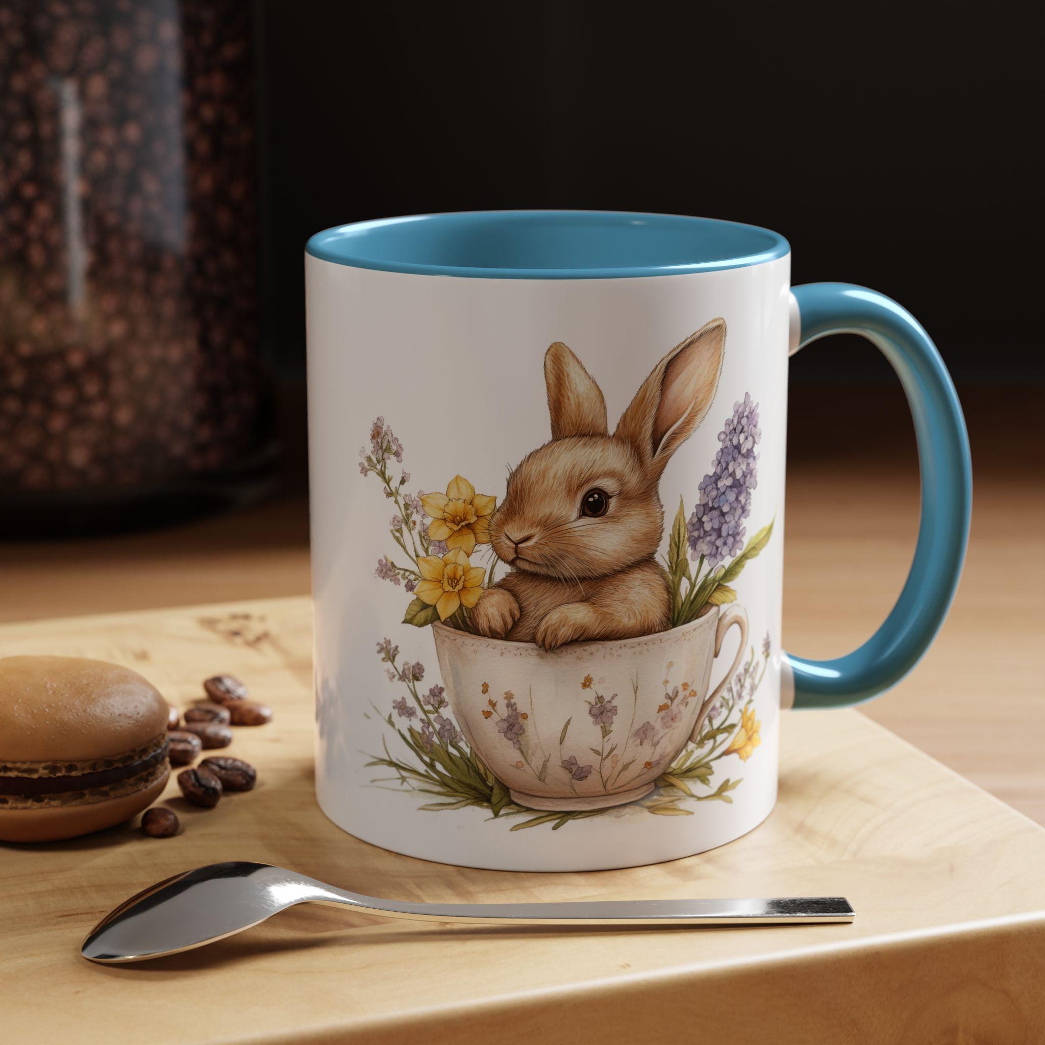 Warm mornings begin with this cheerful ceramic mug. A soft watercolor-style bunny peeks out from a delicate teacup, surrounded by tiny spring blooms — lavender, primrose, and gentle green sprigs. The black interior and handle frame the illustration, letting the artwork feel like a cozy vignette on your counter. Hold it and imagine quiet garden light, slow sips, and a little smile before the day unfolds. It complements serene mornings, relaxed afternoons with a book, or a calm pause between busy tasks.